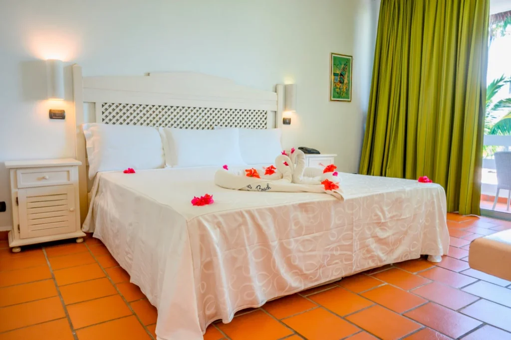 Le 204 camere sono suddivise in 4 blocchi a due piani, tutti a breve distanza dal mare. Sono ampie, luminose e confortevoli, e dispongono di servizi privati elegantemente rinnovati con ampia doccia e bidet, asciugacapelli, aria condizionata, telefono, TV satellitare, cassetta di sicurezza, minifrigo, bollitore per il tè/caffè, terrazzo o patio. A pagamento: consumazioni del minibar con rifornimento su richiesta. Le camere sono divise in king size, con un letto matrimoniale (26 m2 circa; min 1 adulto/max 2 adulti + 1 bambino in letto aggiunto), e queen size, con due letti alla francese (26 m2 circa; min 1 adulto + 1 bambino/max 3 adulti + 1 bambino): entrambe le tipologie sono disponibili con vista giardino o vista mare. Le camere king vista mare plus permettono di godere di diversi plus dedicati. Sono presenti, inoltre, camere comunicanti composte da una camera king size e una camera queen size (min 2 adulti + 2 bambini, max 4 adulti + 1 bambino). Disponibili anche alcune lussuose suite (75 m2 circa; min 1 adulto/max 2 adulti + 1 infant), tutte vista mare, dispongono di una zona giorno con divano e TV e di una zona notte con letto king size, una seconda TV, macchina per caffè espresso con cialde, cabina armadio e ampio bagno con doccia; inoltre per ogni suite un gazebo assegnato in spiaggia relax. Il villaggio ospita clientela internazionale.
