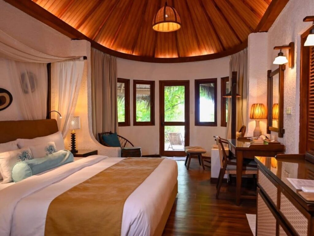 36 camere, 20 beach bungalow (40 m², max 3 adulti), situate sul lato sud dell’isola, e 16 deluxe beach bungalow, situate sul lato nord dell’isola con patio privato (50 m², max 3 adulti) tutte con servizi privati, bagno maldiviano all’aperto, aria condizionata, asciugacapelli, cassetta di sicurezza, connessione wi-fi gratuita, ventilatore a soffitto, bollitore, 2 bottigliette d’acqua gratuite al giorno in camera. A pagamento, minibar. Per i clienti in deluxe beach bungalow è incluso giornalmente un aperitivo al Sunset Bar, caffè in capsule e canapè in camera, noleggio gratuito di attrezzatura snorkeling per tutto il soggiorno.