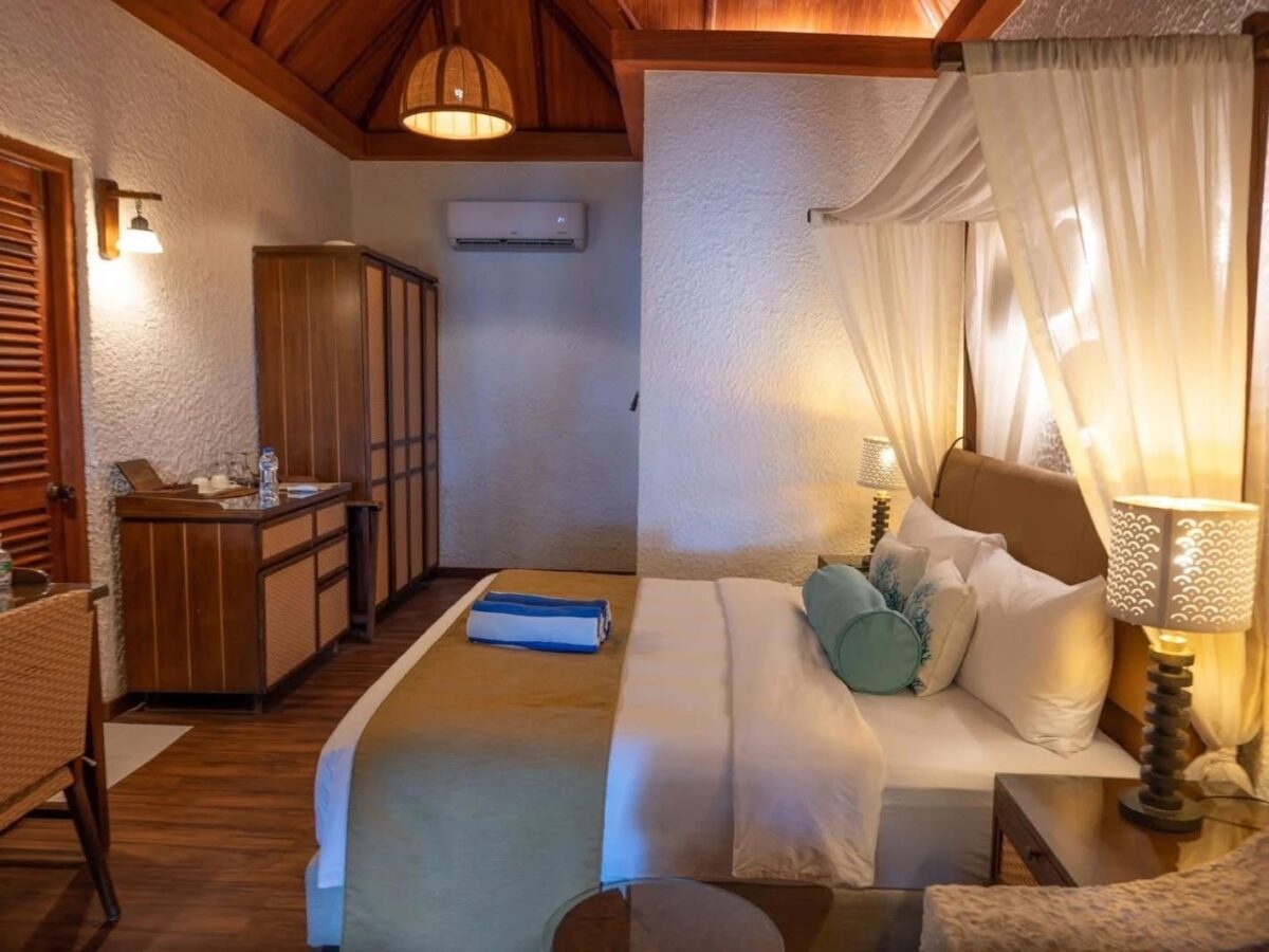 36 camere, 20 beach bungalow (40 m², max 3 adulti), situate sul lato sud dell’isola, e 16 deluxe beach bungalow, situate sul lato nord dell’isola con patio privato (50 m², max 3 adulti) tutte con servizi privati, bagno maldiviano all’aperto, aria condizionata, asciugacapelli, cassetta di sicurezza, connessione wi-fi gratuita, ventilatore a soffitto, bollitore, 2 bottigliette d’acqua gratuite al giorno in camera. A pagamento, minibar. Per i clienti in deluxe beach bungalow è incluso giornalmente un aperitivo al Sunset Bar, caffè in capsule e canapè in camera, noleggio gratuito di attrezzatura snorkeling per tutto il soggiorno.
