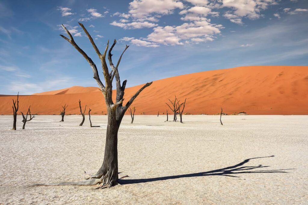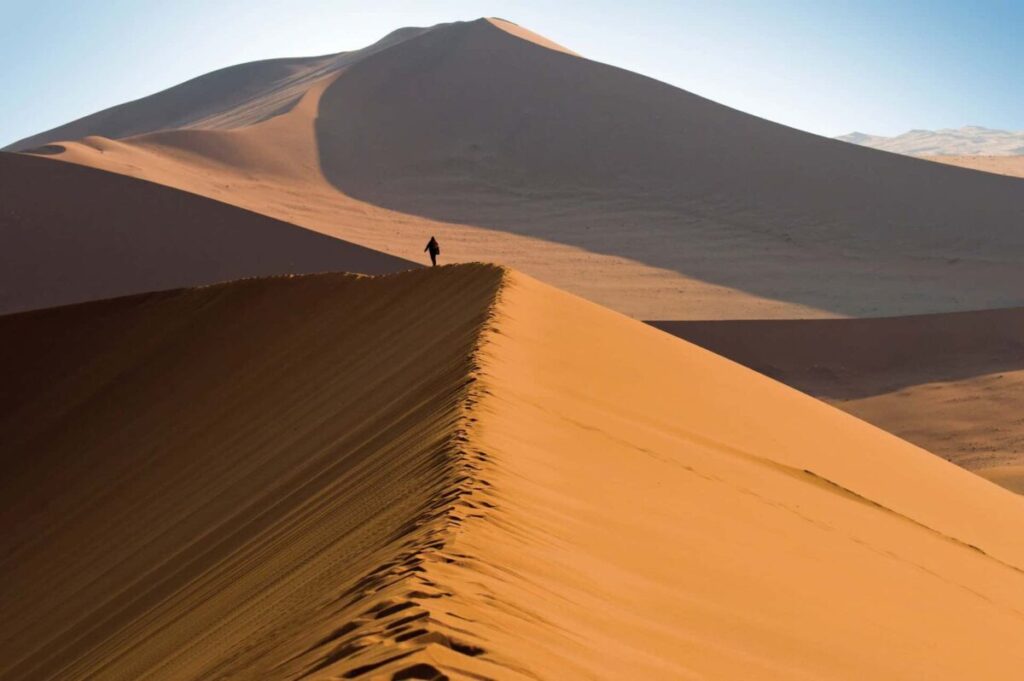Colazione e a seguire escursione con il proprio veicolo nel parco di Sossusvlei: si arriva prestissimo nel cuore del deserto del Namib per avere tutta la mattinata a disposizione per una splendida esperienza in questo mare di sabbia rossa, calda e soffice. È una mattinata all’insegna di grandi passeggiate a volte faticose per coloro che vogliono arrivare fino in cima alla duna più alta del mondo la famosa Duna 45. Il deserto è uno dei punti che affascina maggiormente lasciando nella memoria un ricordo indelebile: spazi immensi, senza barriere, senza ostacoli, solo sabbia, qualche passaggio di orici e struzzi. Una sensazione profonda di grande libertà! Si raggiunge il Deadvlei, uno dei luoghi più famosi del Namib; è ciò che resta di un antico lago, con le carcasse delle acacie intrappolate da secoli nella sabbia. Dall’alto di un percorso circolare si può ammirare un panorama straordinario a 360°. Gli ultimi 5 km saranno percorsi con gli shuttle del luogo. Rientro al lodge e pranzo. Nel pomeriggio una bella passeggiata al Sesriem Canyon oppure per chi lo desiderasse escursione facoltativa da prenotare e pagare direttamente in loco in quad-bike nella riserva. Cena e pernottamento in lodge.